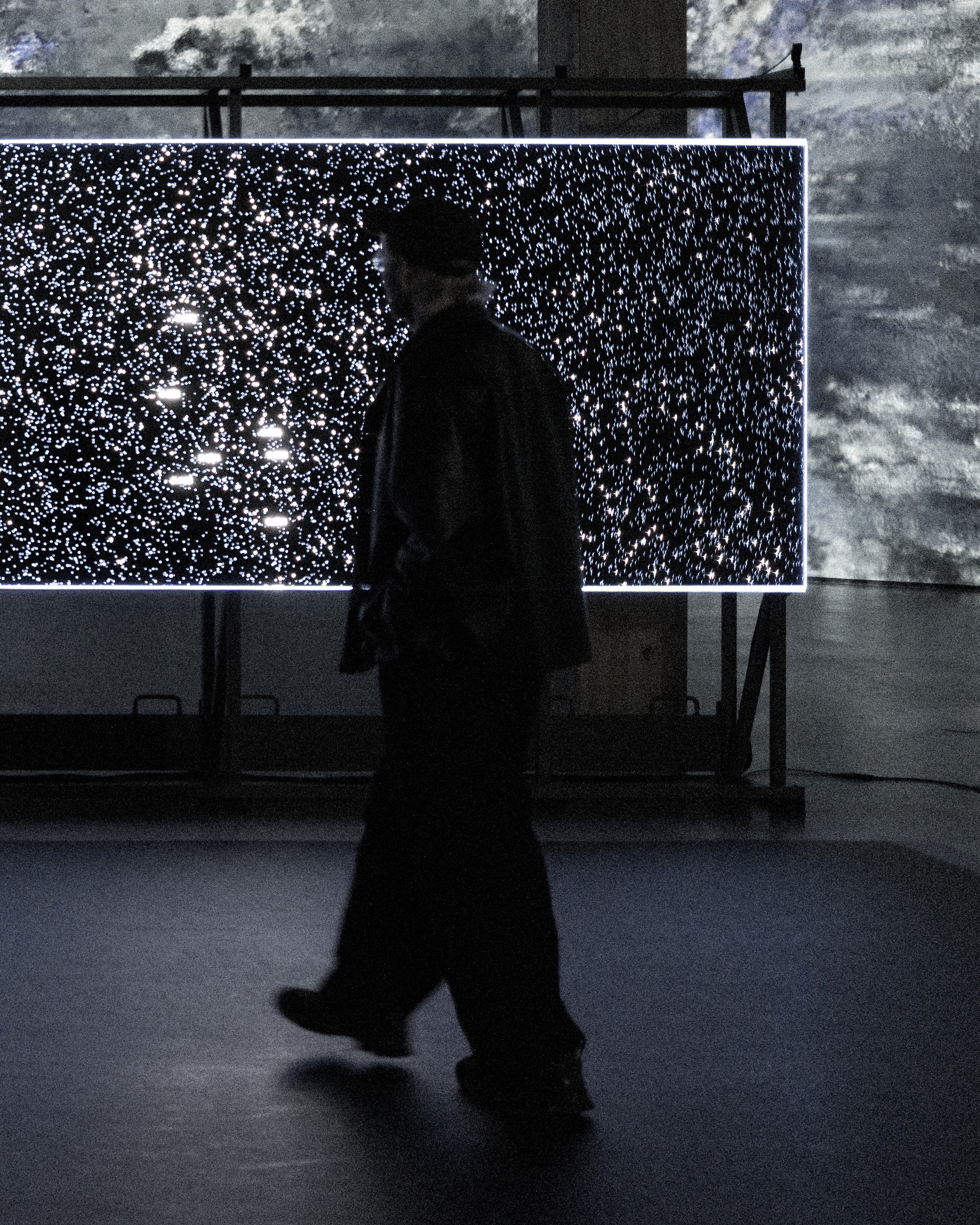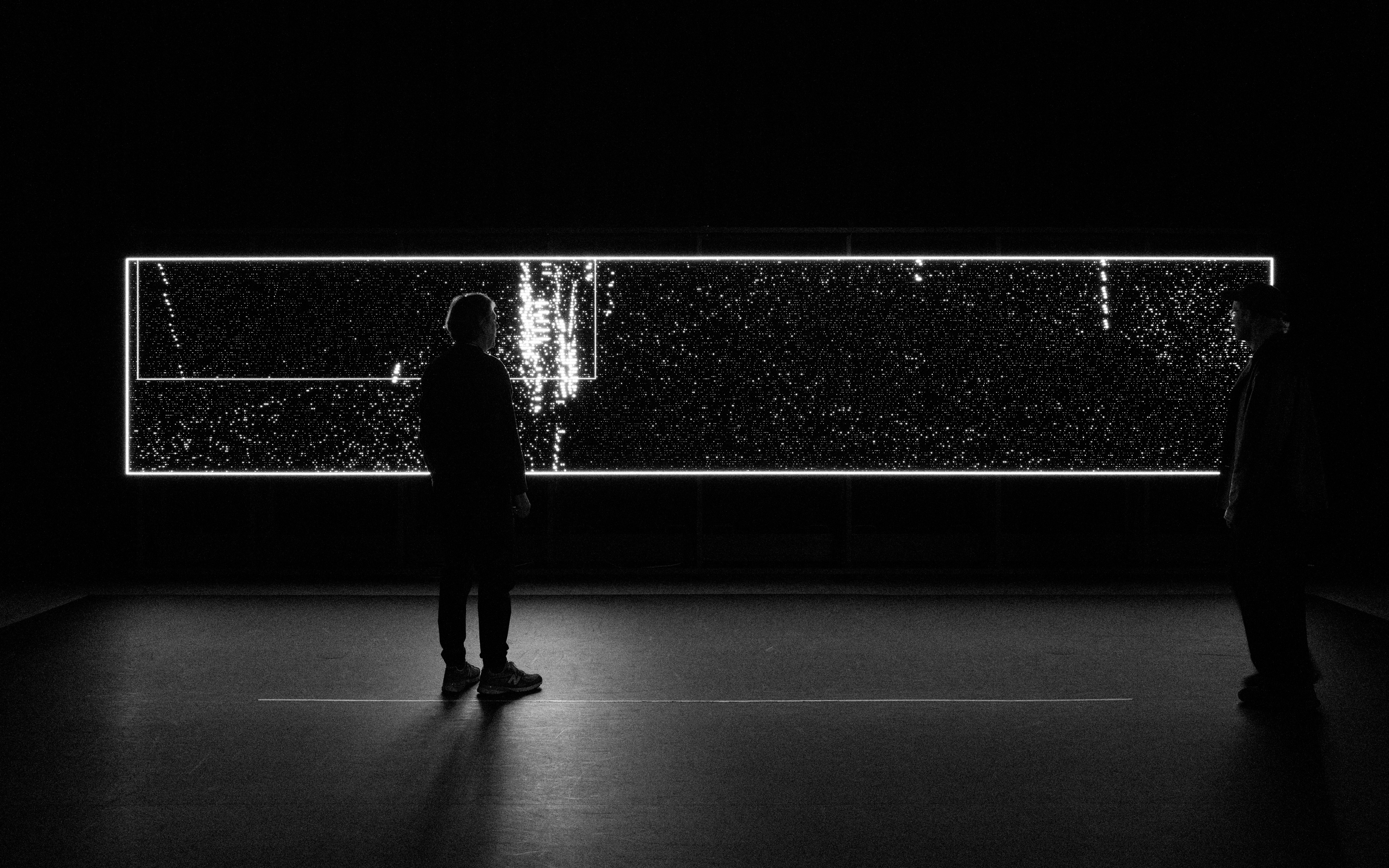 The work creates a digital reflection of observers by constantly generating and regenerating a 3-dimensional light field of the adjacent space. Using real-time imagery from an array of cameras, this field – technically known as a Gaussian splat – is continuously refined in order to identify forms within.