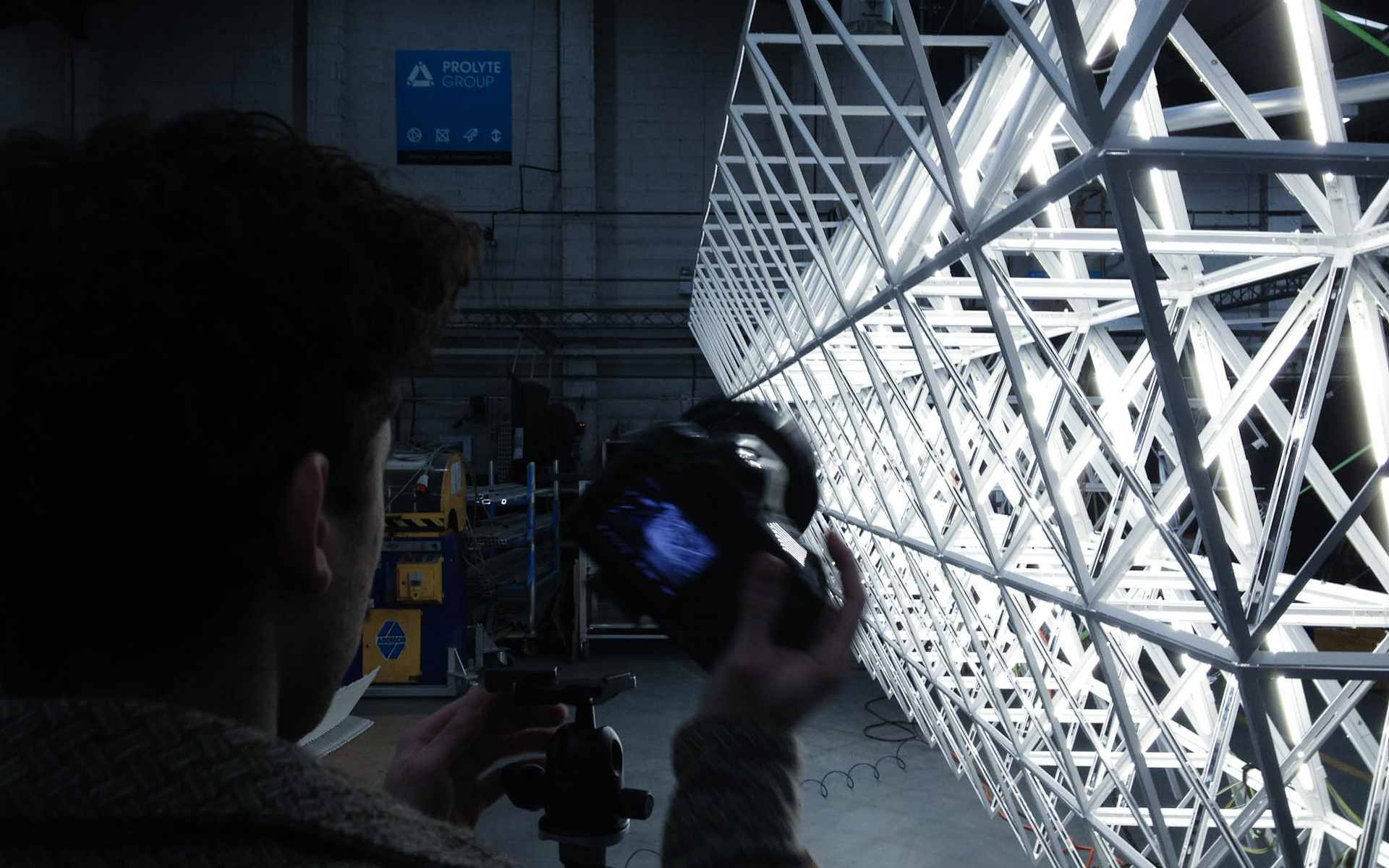 421 octahedron frames are assembled to form an inverted pyramid, suspended in a day-lit atrium, catching and reflecting light downwards into the space. Artificial white light is animated within the structure to create fragmented images.